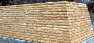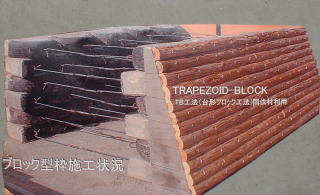 表面に間伐材を取り付けたリサイクルブロック『タイヤップ』で、林道工事・治山工事に利用出来ます。